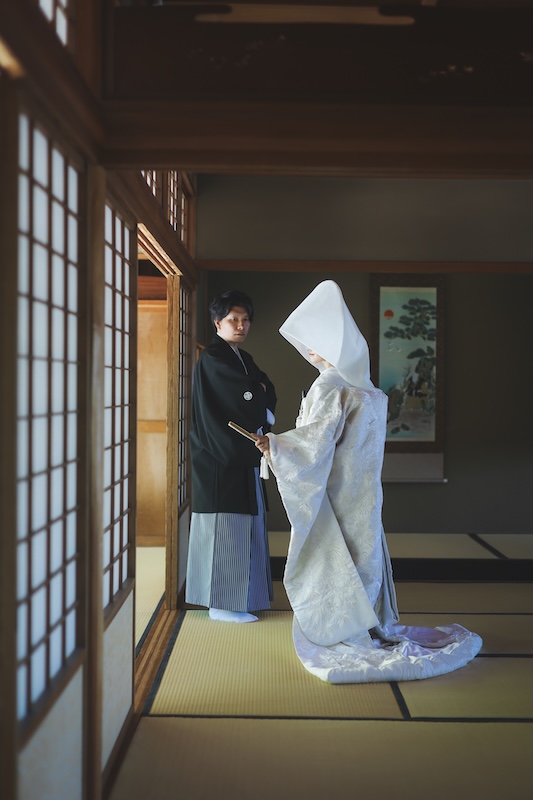 白無垢や色打掛、紋付袴などの和装と日本庭園の景色が調和し
