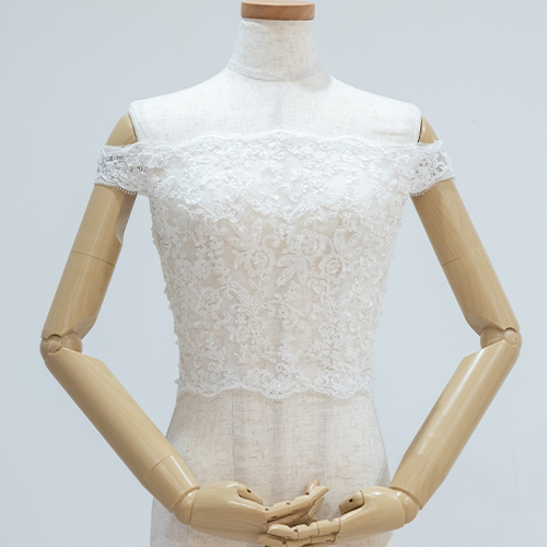 繊細な刺繍がデコルテを美しく引き立て、二の腕まで包み込む上品さを兼ね備えたデザイン。