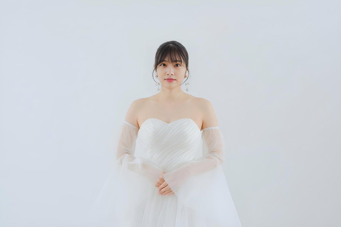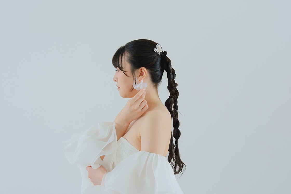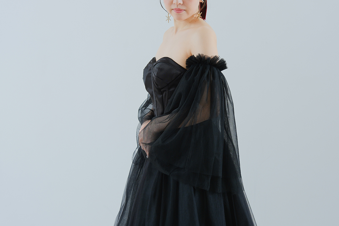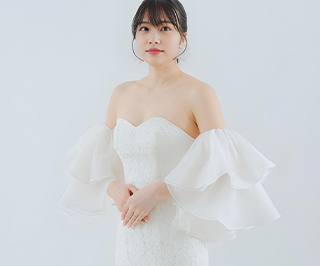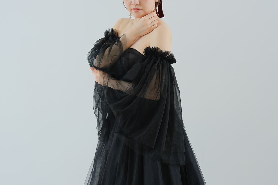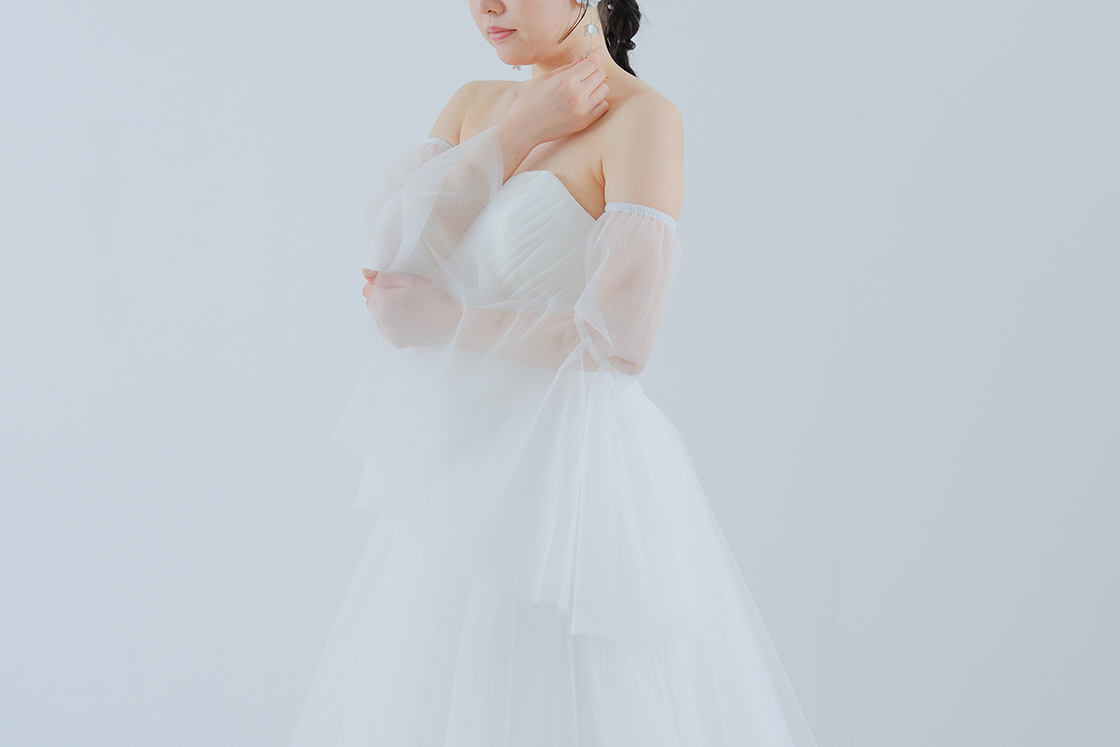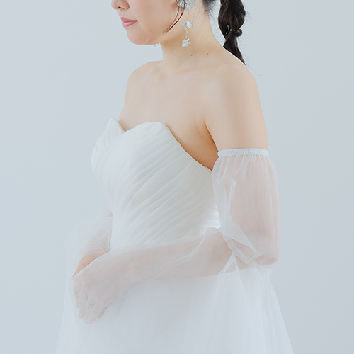 繊細なチュールを重ね、二の腕から手首までをふんわり包み込むようなデザイン。