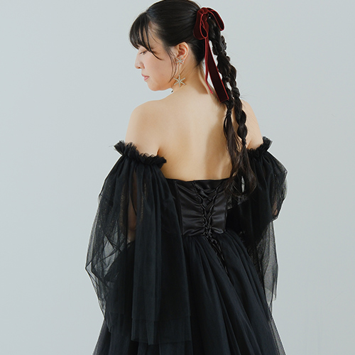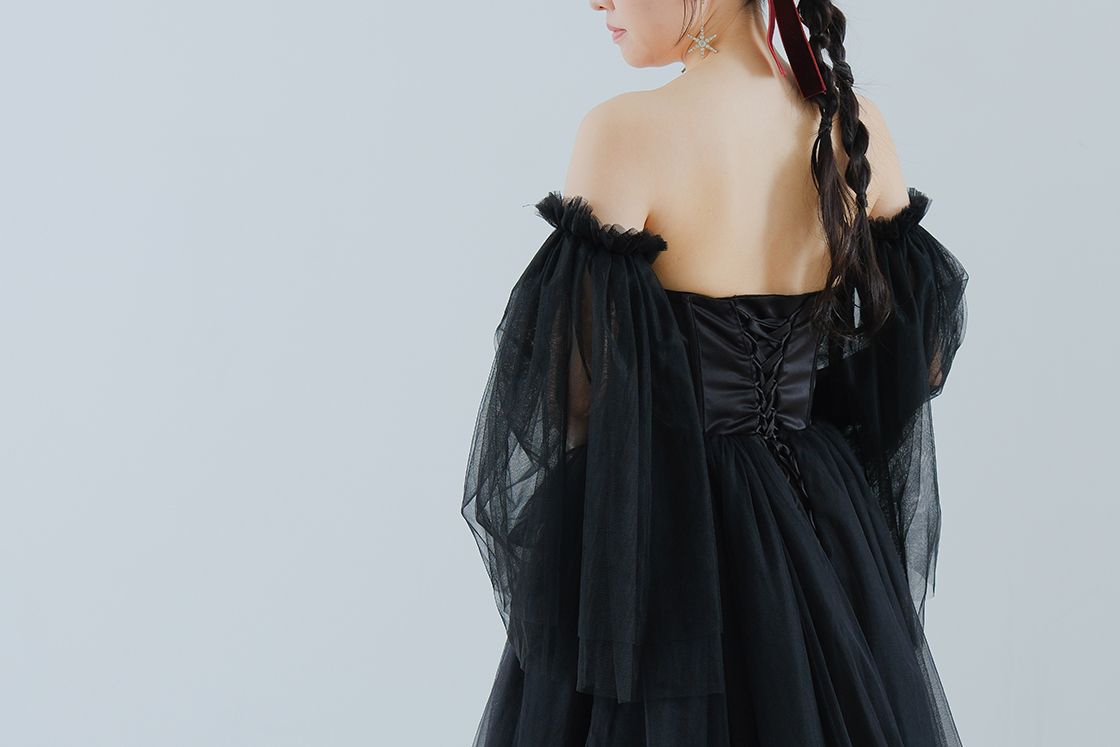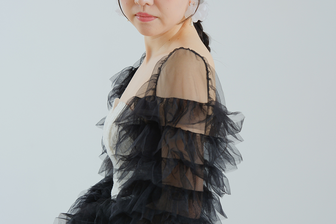 透明感あふれるチュール素材のパフスリーブ。露出とのバランスを絶妙に調整。
